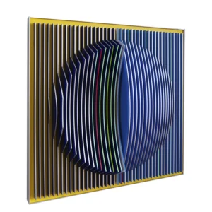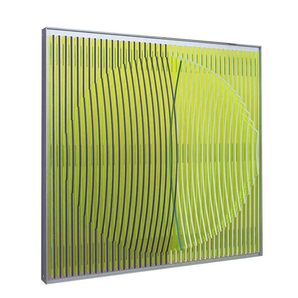J. Margulis cria arte geométrica abstrata com elementos cinéticos, manifestando-se como esculturas 3D de parede e chão, feitas de plexiglass e alumínio. As cores são aplicadas nas bordas das aletas, formando composições que exploram contrastes entre fundos claros e escuros. A natureza cinética da obra muda conforme a perspectiva do espectador, simbolizando empatia. Recentemente, integrei caracteres escritos em minhas peças, onde frases curtas criam estruturas que vibram contra fundos contrastantes. Influenciada por espiritualidade, filosofia oriental e geometria, minha arte explora formas básicas e transições inesperadas, resultando em composições equilibradas e pessoalmente significativas.
