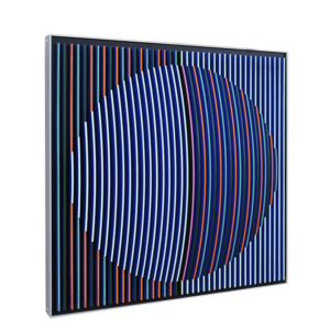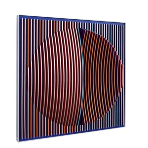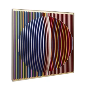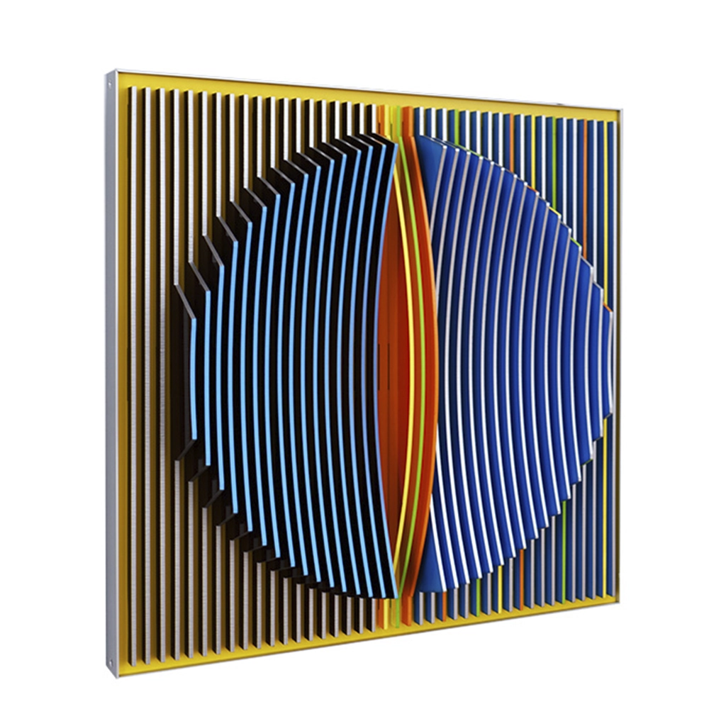 J. Margulis cria arte geométrica abstrata com elementos cinéticos, manifestando-se como esculturas 3D de parede e chão, feitas de plexiglass e alumínio. As cores são aplicadas nas bordas das aletas, formando composições que exploram contrastes entre fundos claros e escuros. A natureza cinética da obra muda conforme a perspectiva do espectador, simbolizando empatia. Recentemente, integrei caracteres escritos em minhas peças, onde frases curtas criam estruturas que vibram contra fundos contrastantes. Influenciada por espiritualidade, filosofia oriental e geometria, minha arte explora formas básicas e transições inesperadas, resultando em composições equilibradas e pessoalmente significativas.