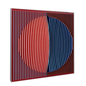 J. Margulis cria arte geométrica abstrata com elementos cinéticos, manifestando-se como esculturas 3D de parede e chão, feitas de plexiglass e alumínio. As cores são aplicadas nas bordas das aletas, formando composições que exploram contrastes entre fundos claros e escuros. A natureza cinética da obra muda conforme a perspectiva do espectador, simbolizando empatia. Recentemente, integrei caracteres escritos em minhas peças, onde frases curtas criam estruturas que vibram contra fundos contrastantes. Influenciada por espiritualidade, filosofia oriental e geometria, minha arte explora formas básicas e transições inesperadas, resultando em composições equilibradas e pessoalmente significativas.
