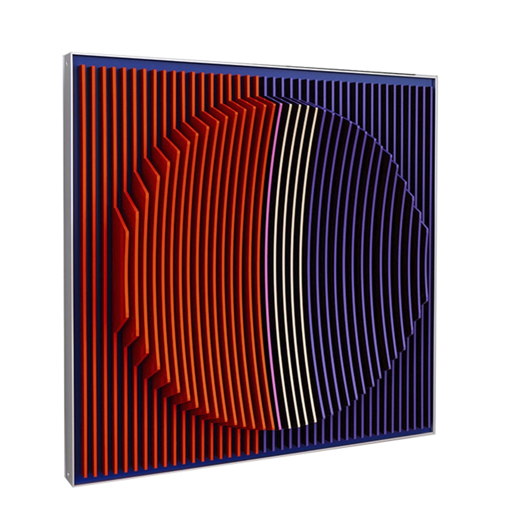 J. Margulis cria arte geométrica abstrata com elementos cinéticos, manifestando-se como esculturas 3D de parede e chão, feitas de plexiglass e alumínio. As cores são aplicadas nas bordas das aletas, formando composições que exploram contrastes entre fundos claros e escuros. A natureza cinética da obra muda conforme a perspectiva do espectador, simbolizando empatia. Recentemente, integrei caracteres escritos em minhas peças, onde frases curtas criam estruturas que vibram contra fundos contrastantes. Influenciada por espiritualidade, filosofia oriental e geometria, minha arte explora formas básicas e transições inesperadas, resultando em composições equilibradas e pessoalmente significativas.