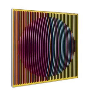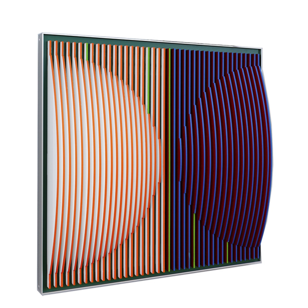 A natureza cinética do meu trabalho garante que ele mude à medida que os espectadores se movem ao redor dele, oferecendo perspectivas radicalmente diferentes de vários ângulos. Essa observação dinâmica atua como uma metáfora para a empatia—ver a realidade através da perspectiva do outro, sem julgamento. Os fundos contrastantes realçam os aspectos tridimensionais e cinéticos, evocando respostas emocionais a códigos de cores específicos que muitas vezes induzem um estado de transe, fundindo o espectador com a peça.