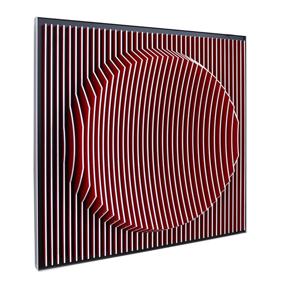 J. Margulis cria arte geométrica abstrata com elementos cinéticos, manifestando-se como esculturas 3D de parede e chão, feitas de plexiglass e alumínio. As cores são aplicadas nas bordas das aletas, formando composições que exploram contrastes entre fundos claros e escuros. A natureza cinética da obra muda conforme a perspectiva do espectador, simbolizando empatia. Recentemente, integrei caracteres escritos em minhas peças, onde frases curtas criam estruturas que vibram contra fundos contrastantes. Influenciada por espiritualidade, filosofia oriental e geometria, minha arte explora formas básicas e transições inesperadas, resultando em composições equilibradas e pessoalmente significativas.