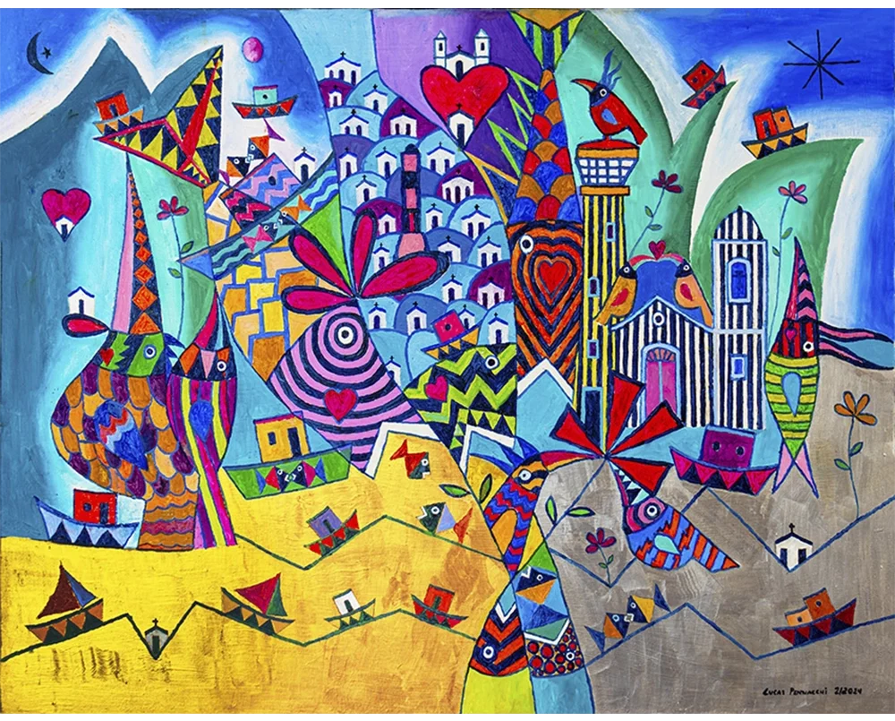 Lucas Pennacchi – Flores. Óleo sobre tela, 70×90 cm, 2024. Código: 20460 Registre Interesse Assinado canto inferior direito.Um dos principais méritos do artista plástico Lucas Pennacchi é a inquietação. Seja com tinta acrílica, areia, nanquim ou outros materiais, ele consegue transformar a sua experimentação técnica em resultados dos mais diversos, que vão desde o desenho e a aquarela a trabalhos com tinta a óleo, com várias diluições. Sua estrutura visual provém, em parte, da infância passada junto aos murais pintados na sua casa pelo pai, o artista Fulvio Pennacchi, e ao convívio com ele, principalmente a partir de 1985, quando decidiu dedicar-se à arte profissionalmente. No início, com paisagens singelas, obtinha os melhores resultados, quando deixava a imaginação o levar livremente a partir de referenciais concretos. Mostrava assim que seu ofício era o de criar, estabelecendo um padrão singular, lírico e quase ingênuo, no sentido de deixar fluir a intuição, amparando-a pela conquista do domínio técnico. Em 1993, as séries de pássaros e peixes ganharam espaço e mostravam um trabalho em que a cor ganhava um progressivo espaço. Esses animais se tornaram autênticos personagens de uma saga repleta de alegria visual, embora alguns deles pareçam, às vezes, introspectivos e mesmo tristes. Nascido sob o signo de Peixes e amante da pescaria, Lucas mergulhou no mundo desses seres com facilidade. E discorre sobre eles com desenvoltura, construindo diferentes composições, nas quais muitas vezes predominam certos padrões geométricos e repetições que surgem como recursos plásticos para explorar o espaço. Os pássaros, por sua vez, têm personalidade própria. Cada um constitui um paradigma de emoções e sentimentos, que vão dos mais positivos e alegres aos mais reservados. Bicos longos, pequenos adereços e o diálogo entre as cores são essenciais nesse processo de construção, em que o lúdico desempenha um papel primordial. Humor, lirismo e poesia se mesclam num processo criativo que envolve observação do real e imaginação. O resultado é um estilo próprio em progressiva mutação rumo a uma limpeza plástica. O uso maior dos espaços vazios, do suporte e experiências com preto e branco são provas de que Lucas Pennacchi não quer estagnar, mesclando as cores de seus pássaros e peixes e a delicadeza de suas paisagens.” Oscar D’Ambrosio, jornalista e mestre em Artes Visuais pelo Instituto deArtes da UNESP, integra a Associação Internacional de Críticos de Arte (AICA-Seção Brasil). Outras obras do artista Lucas Pennacchi – Bicos carnavalescos. Óleo sobre tela, 40×70 cm, 2023 Lucas Pennacchi – Beijo natureza. Óleo sobre tela, 100×70 cm, 2022. Lucas Pennacchi – Flores. Óleo sobre tela, 70×90 cm, 2024. Lucas Pennacchi – Luz. Óleo sobre tela, 80×80 cm, 2021. Lucas Pennacchi – Peixe em meditação. Óleo sobre tela, 70×100 cm, 2021.